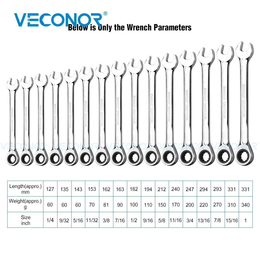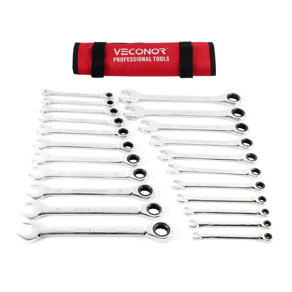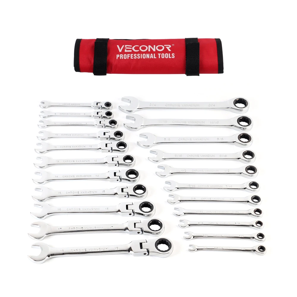 VECONOR 22-Pieces SAE Metric Ratchet Wrench Set with Portable Roll-up Pouch SAE 1/4inch to 3/4inch Flex Fixed Head Metric 6mm to 18mmSAE & Metric Sizes - SAE : 1/4,5/16,9/16,11/32,3/8,7/16,1/2,9/16,5/8,11/16,3/4 inch and Flex-Head Metric : 6,8,9,10,12,13,14,15,16,17,18mm