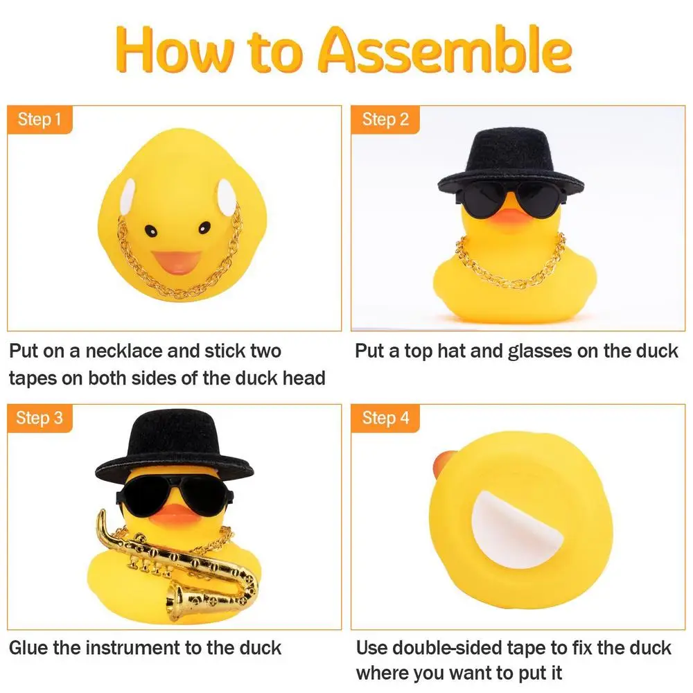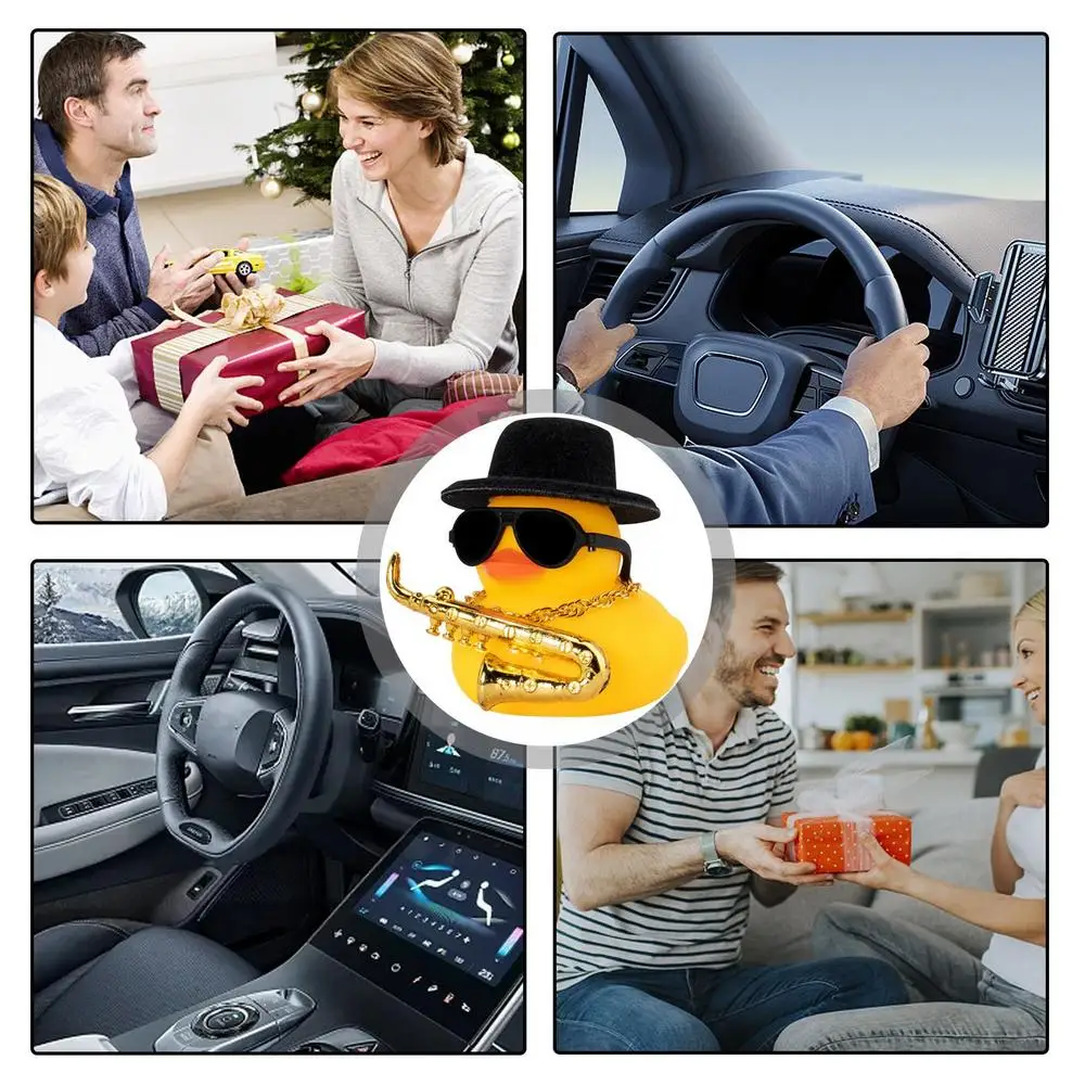 3.Unique Addition: Turn heads on the road with an adorable car duck featuring sunglasses, a gold necklace, and mini hats in various colors. Its charming design is sure to make a statement on your dashboard.