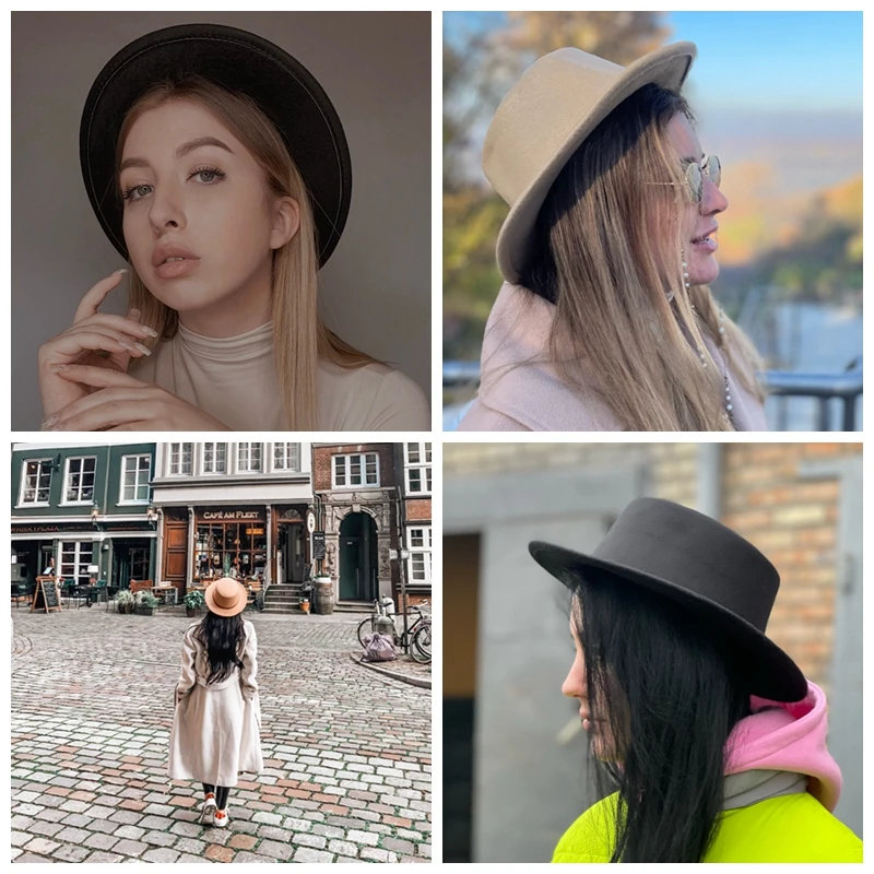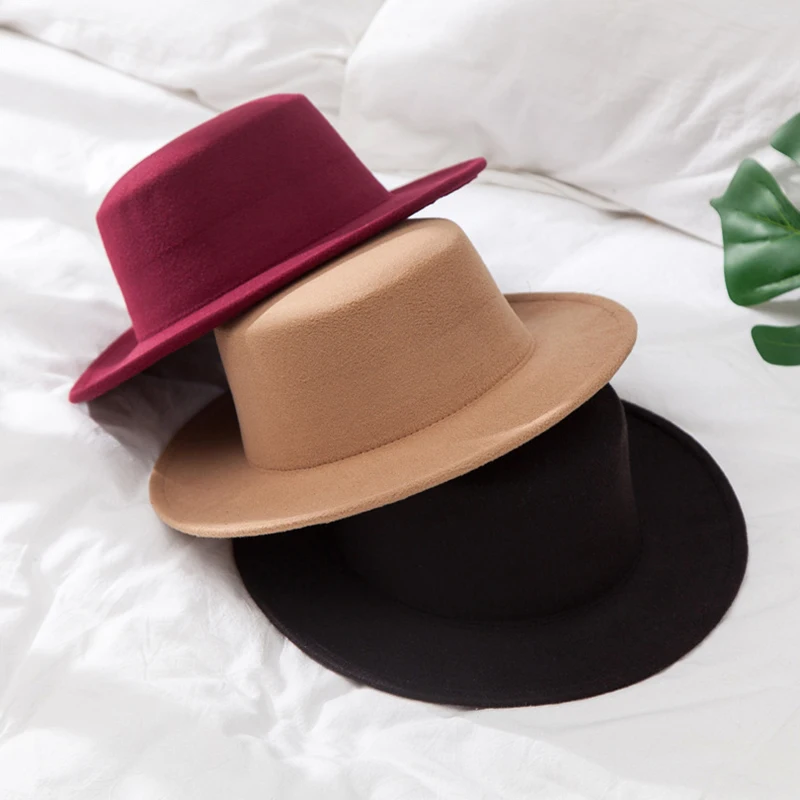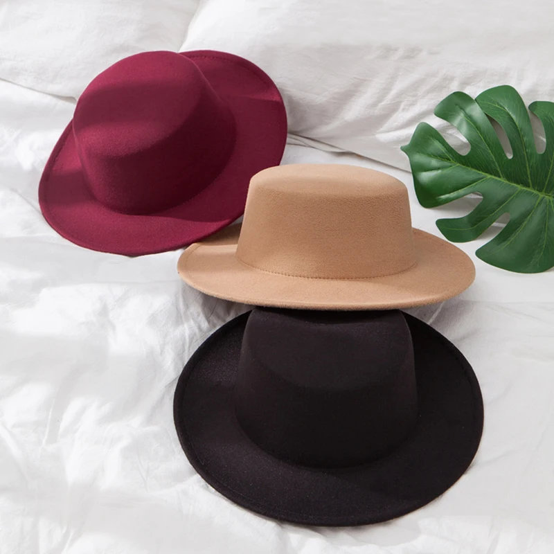 Flat Fedoras Hats for Women Classic British Jazz Cap Imitation Woolen Wide Brim