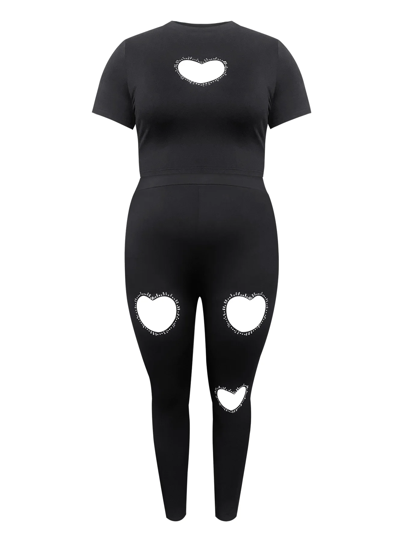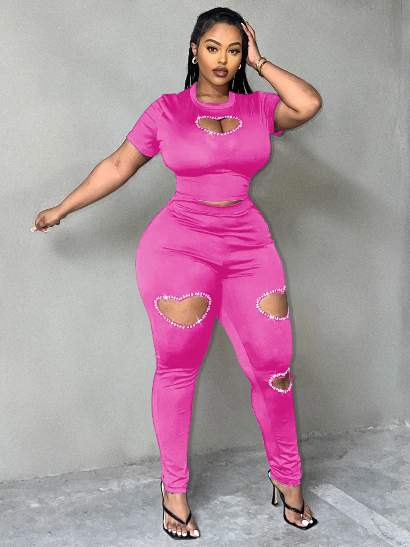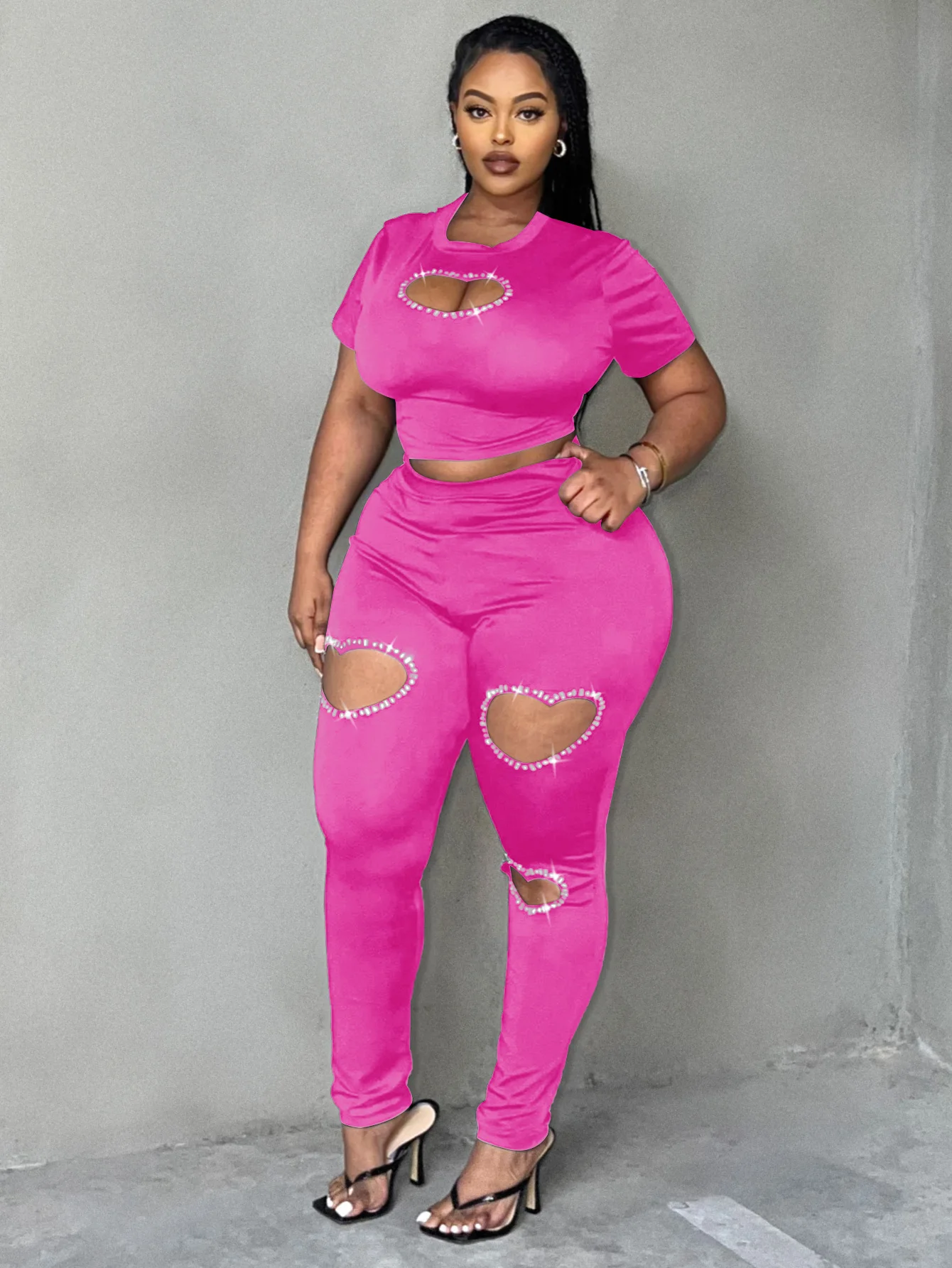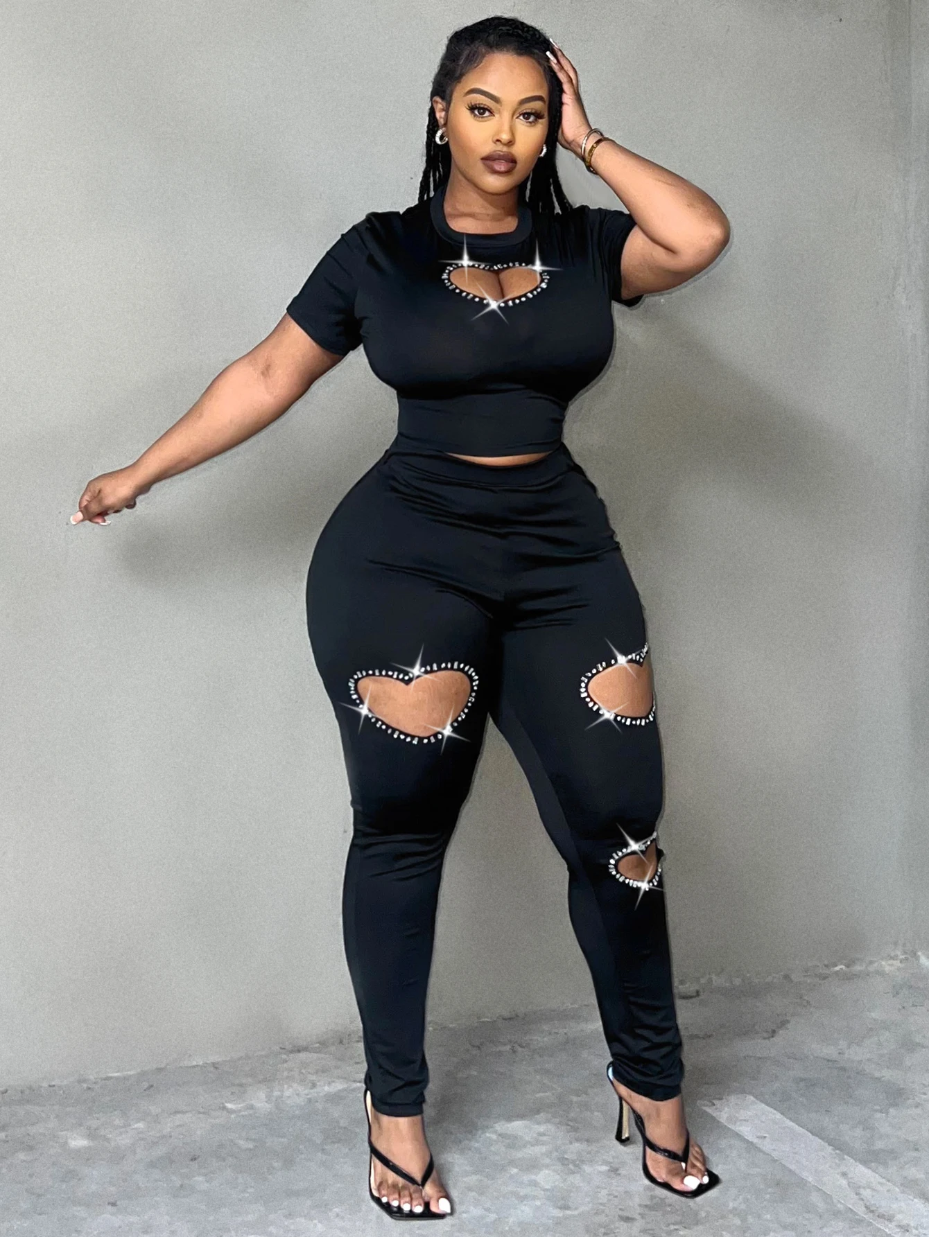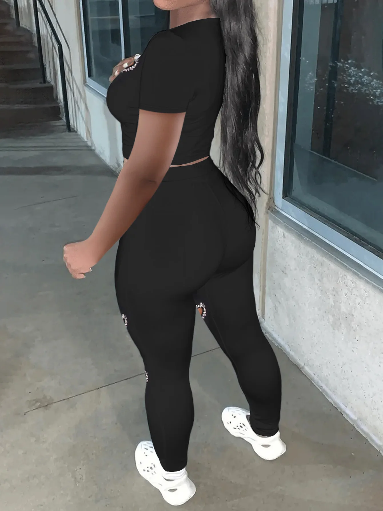 LW Crop Top Rhinestone Heart Decor Pant Set Women Spring Summer Short Sleeve T-s