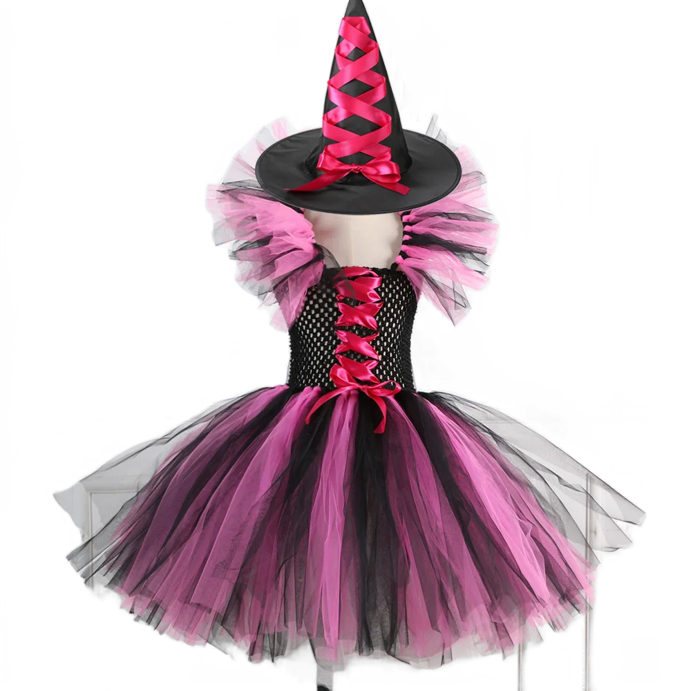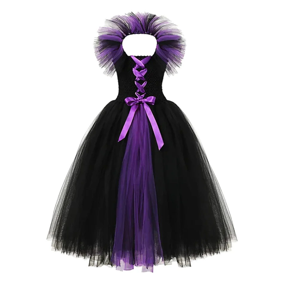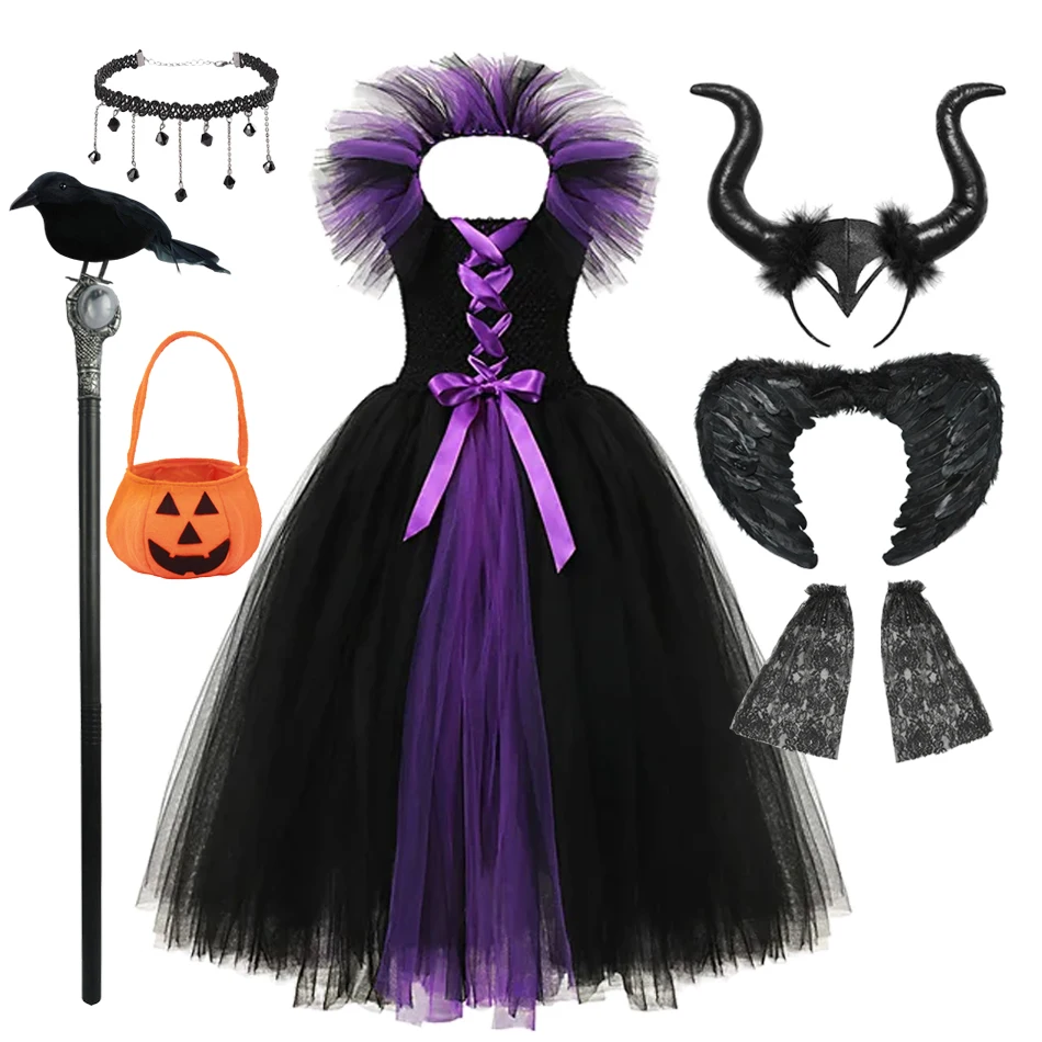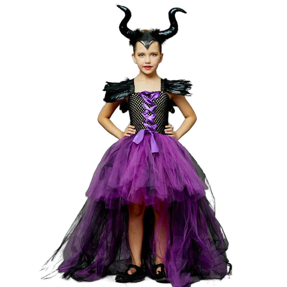 Maleficent Dark Queen Halloween Witch Girl Costume Deluxe Black Glam Vestidos Party Dress Kids Robe Cosplay Clothes