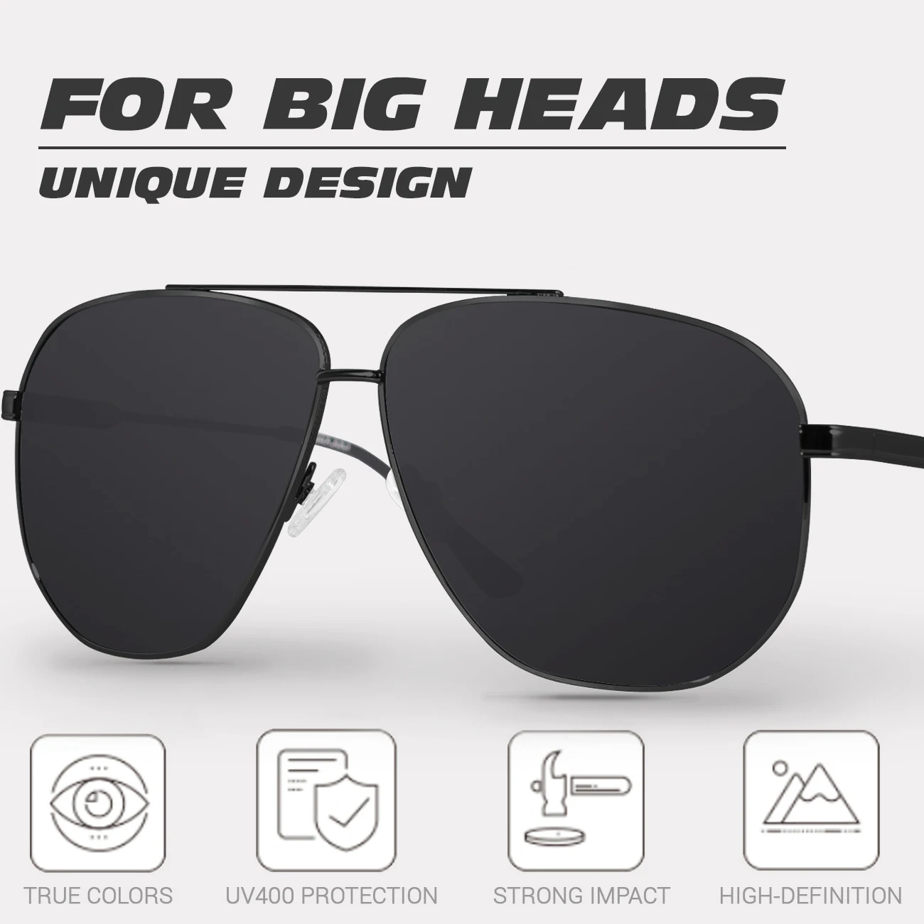 【Sunglasses for Big Heads】Those who require a larger frame size due to their head proportions. The large size frame of these sunglasses is specially designed for people with big heads, so you don't have to worry about not being able to buy glasses in the right size.