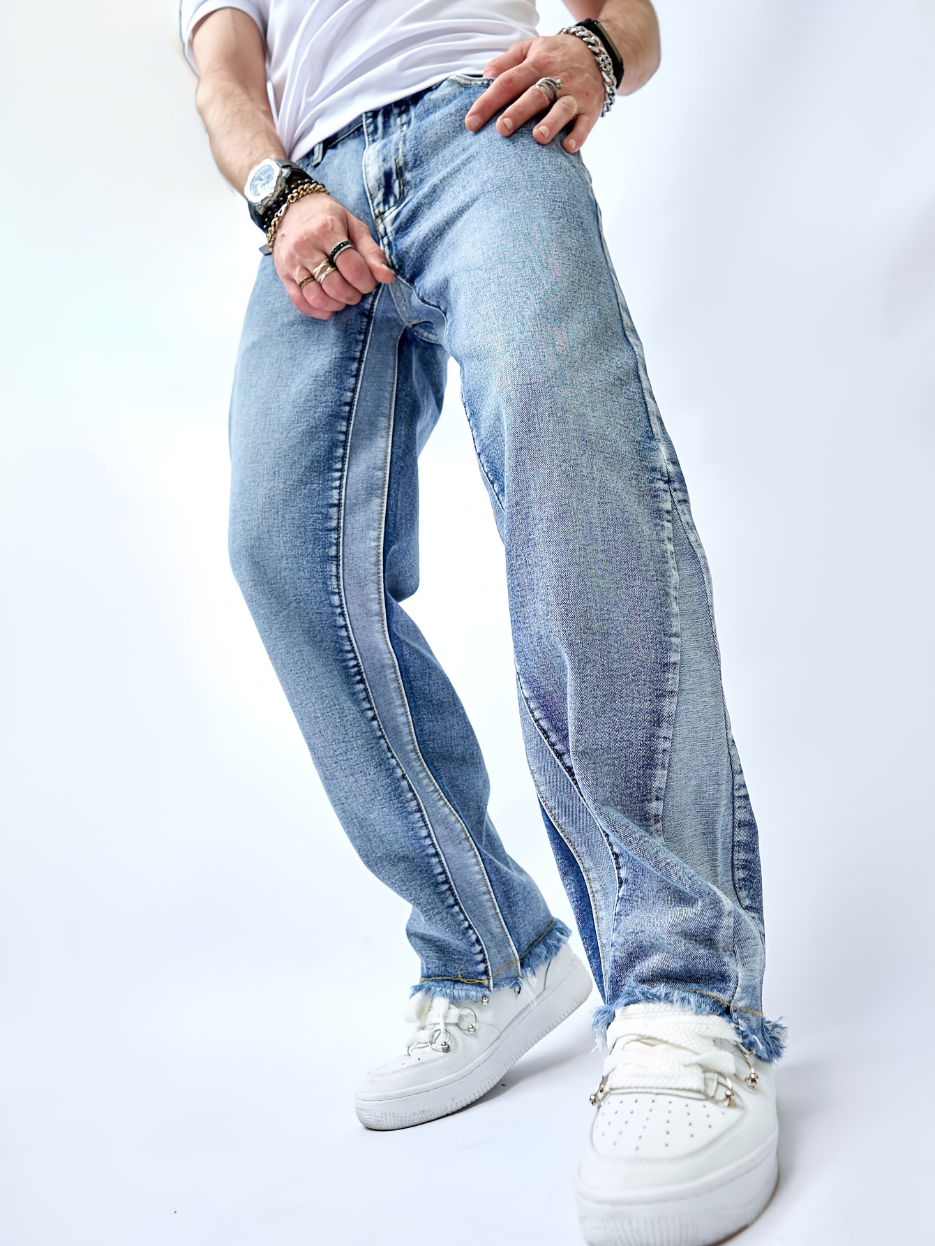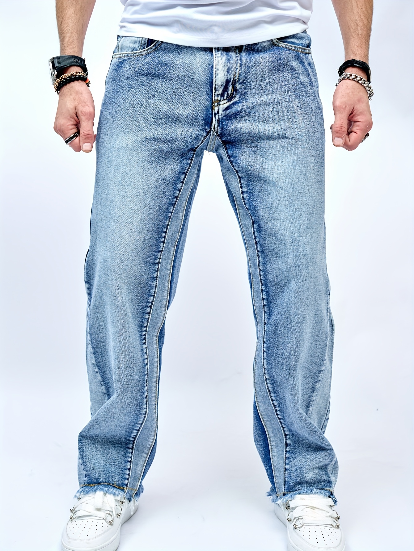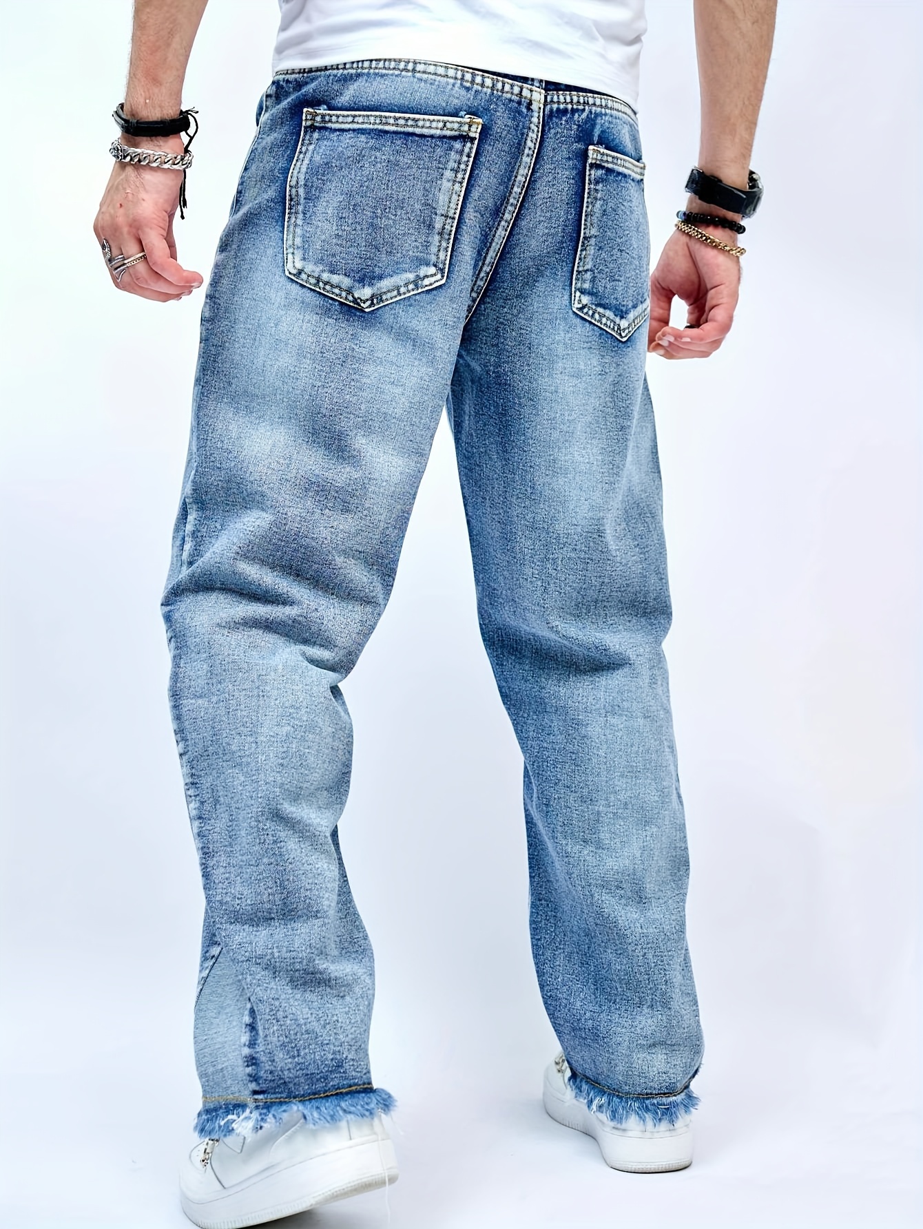 Men's Distressed Hip-Hop Style Jeans - Loose Fit, Straight Leg Denim with Patchw