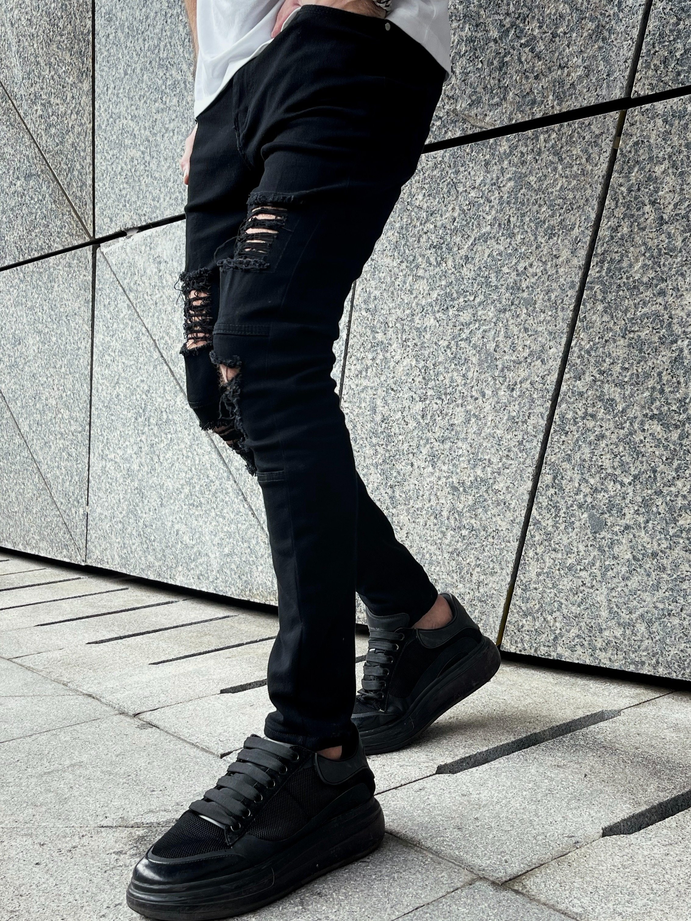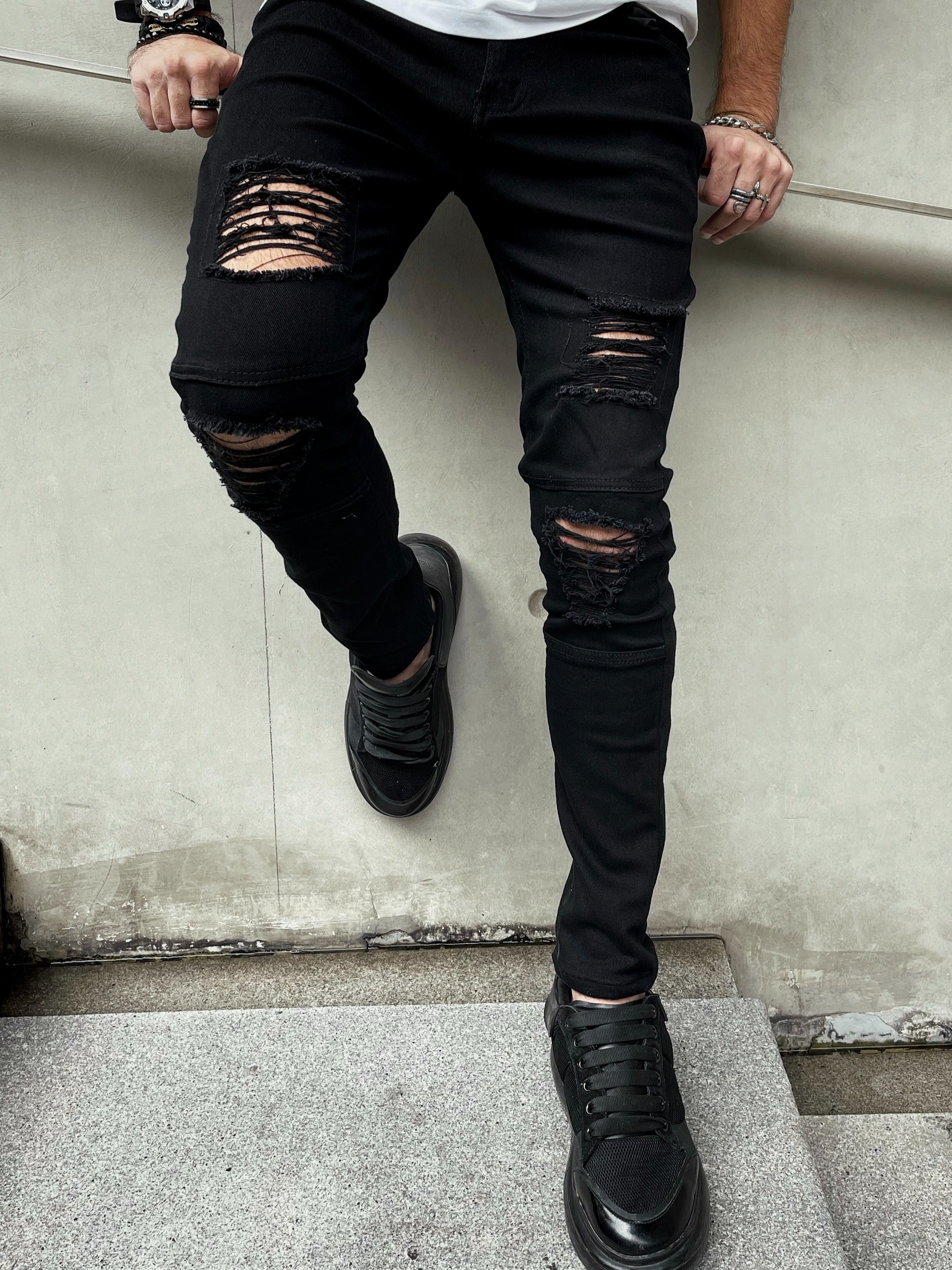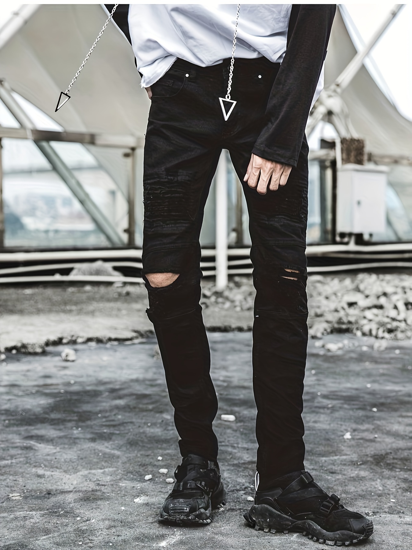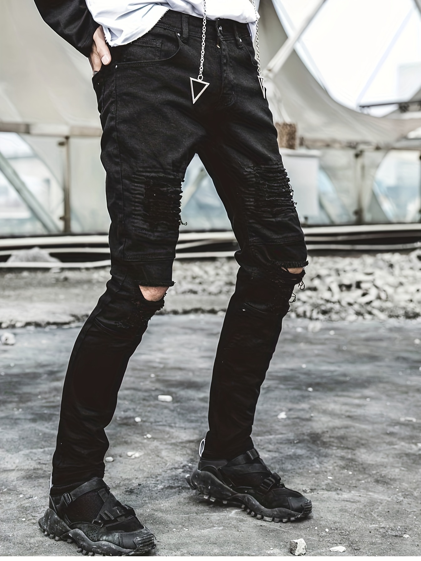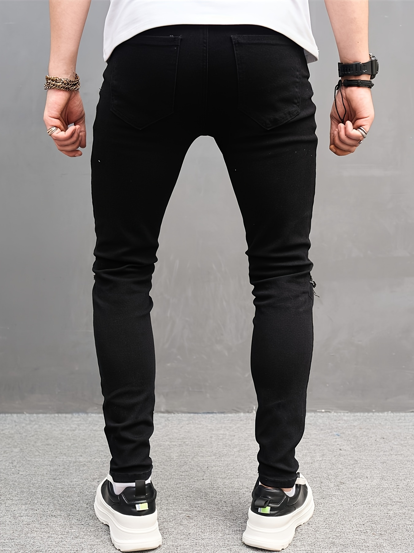 Men's Slim-Fit Ripped Jeans - Stretch Denim, Solid Color, Hip Hop Style for All
