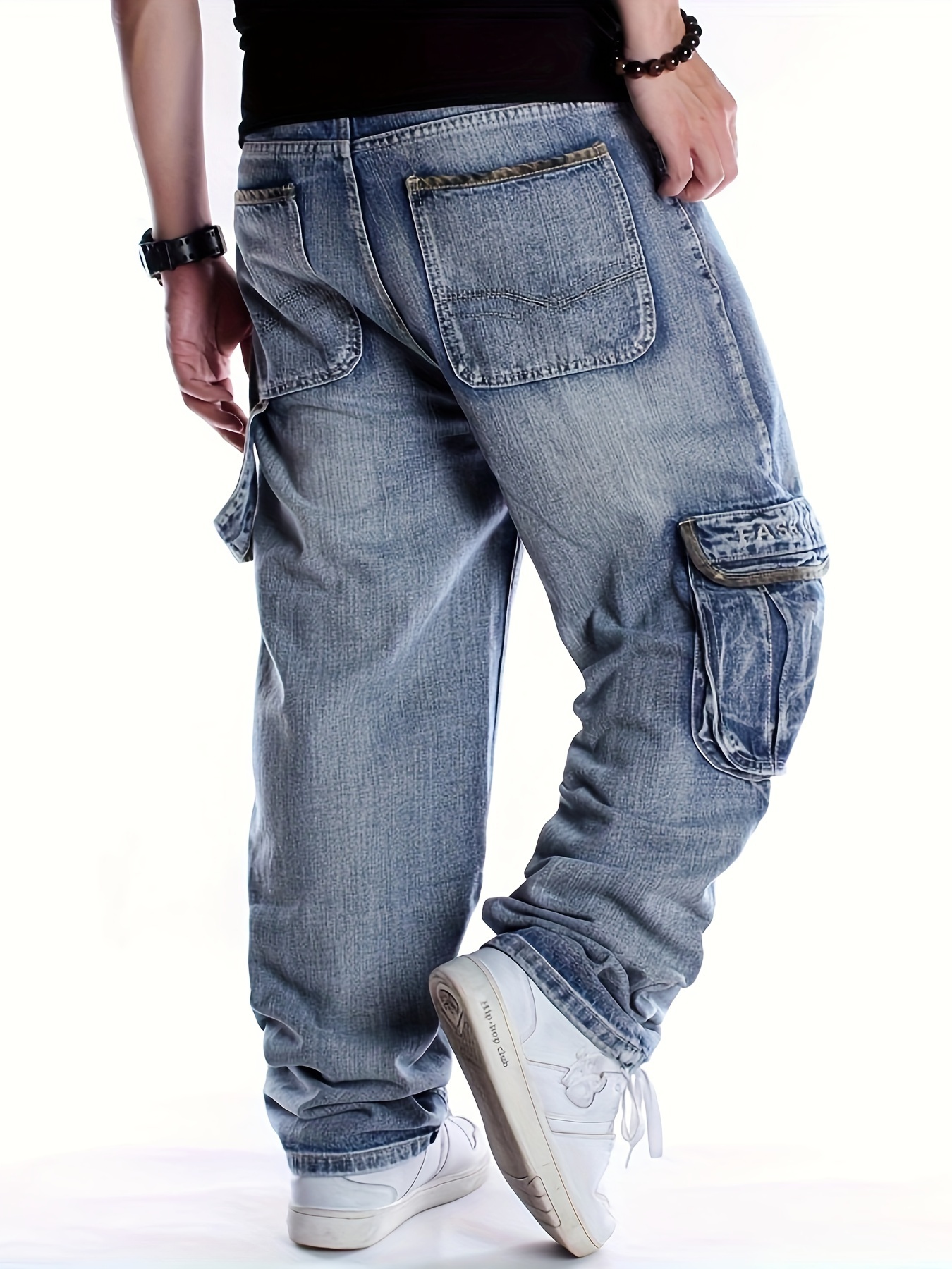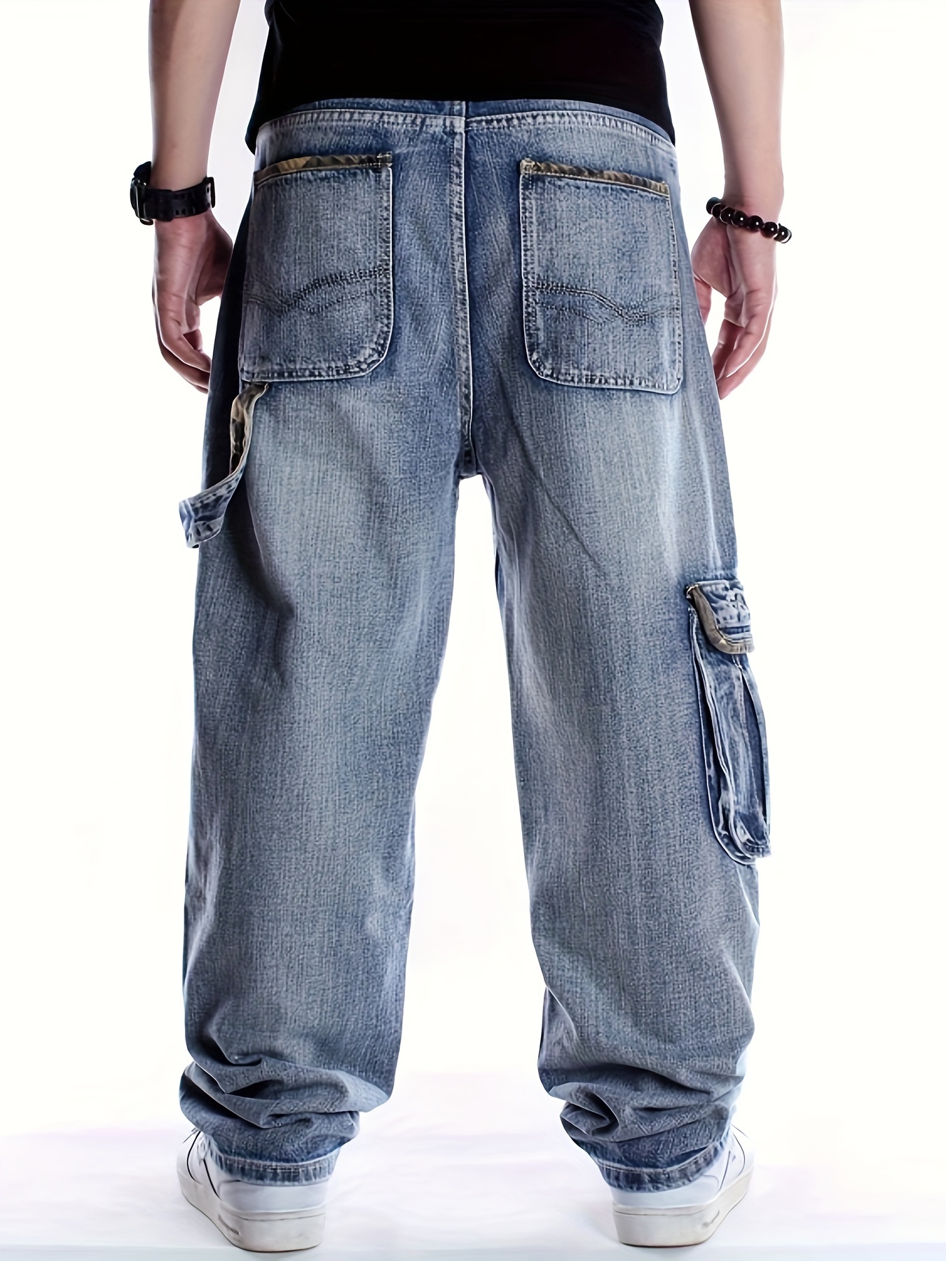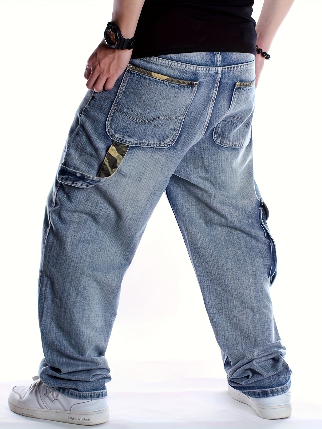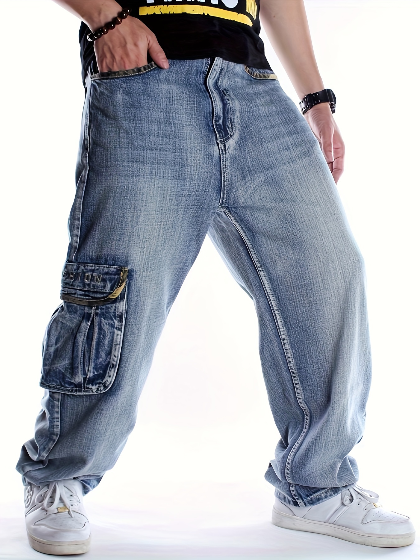 Plus Size Men's Loose Straight Leg Round Neck Multi Pocket Jeans for Street Danc