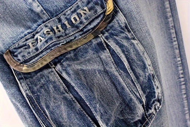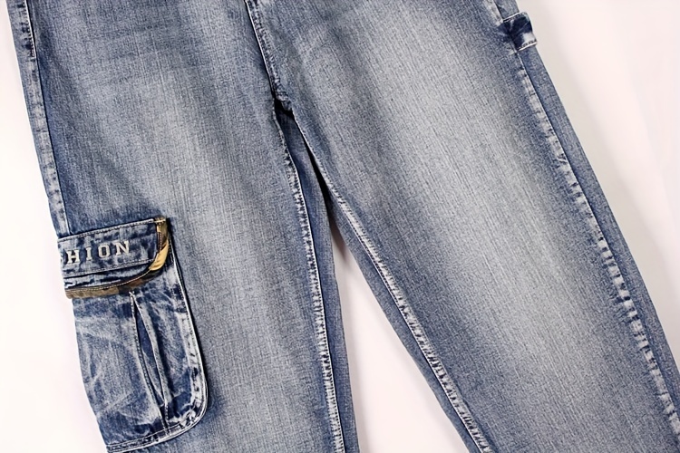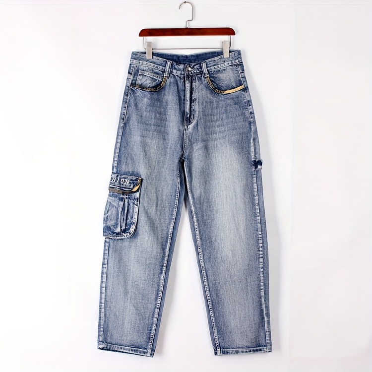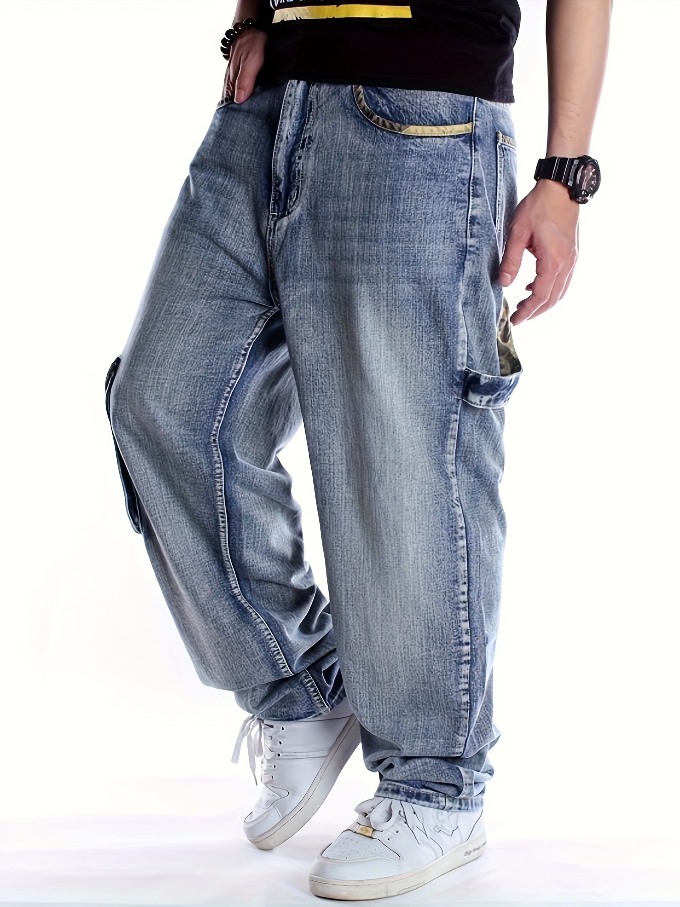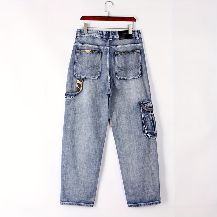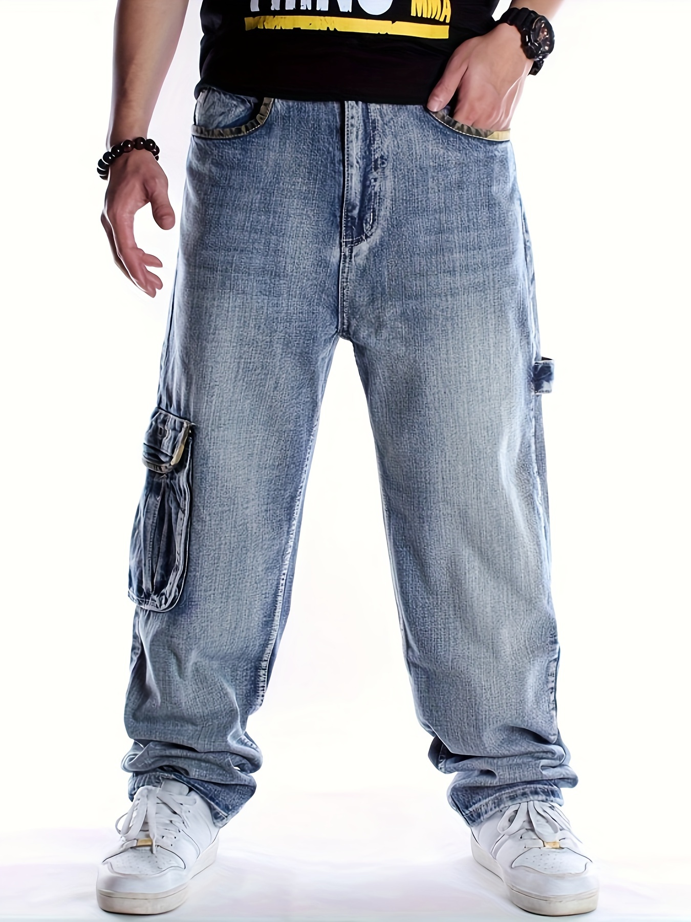 Plus Size Men's Loose Straight Leg Round Neck Multi Pocket Jeans for Street Danc