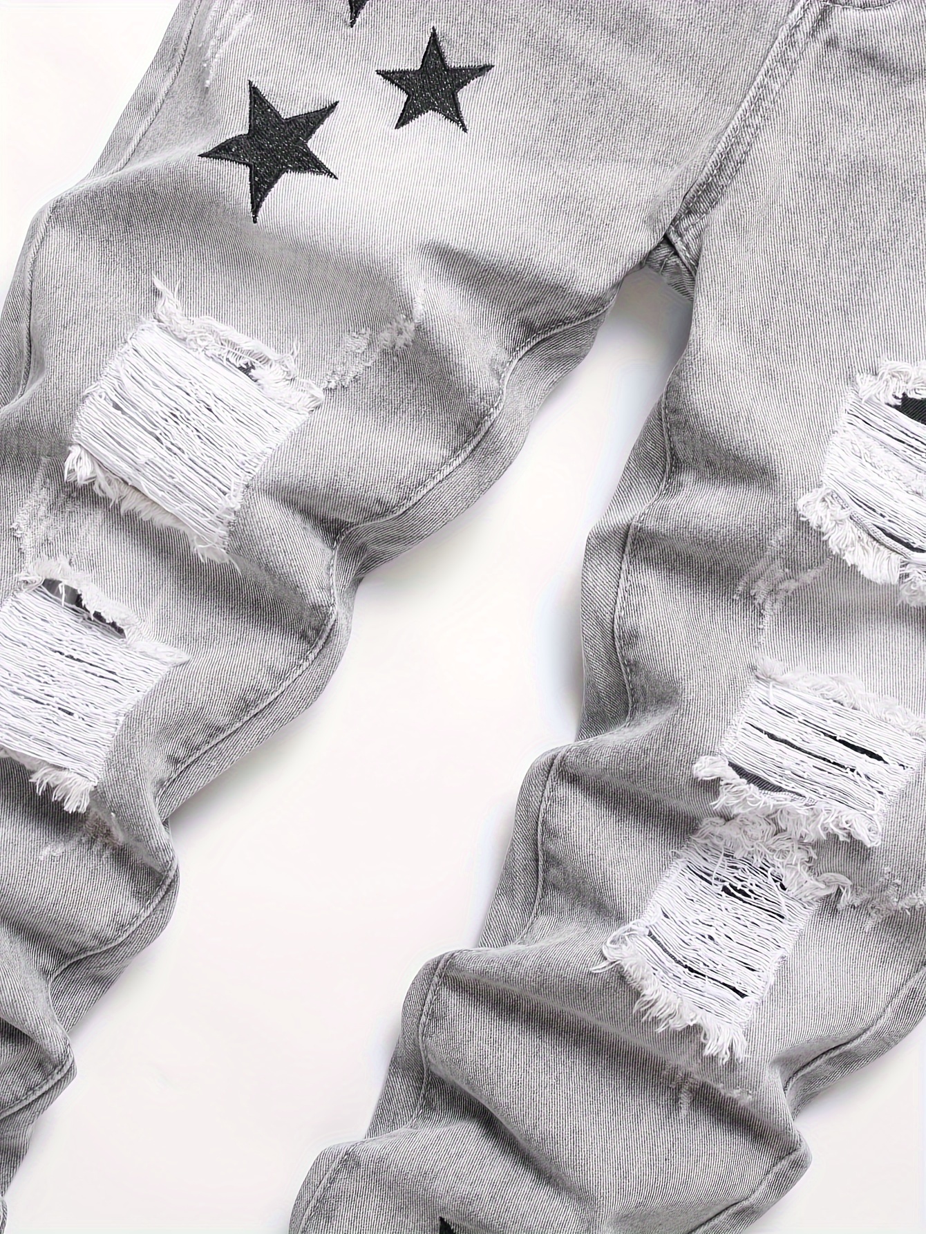Upgrade Your Denim Game With These Men's Star Embroidered Slim Fit Jeans. Designed For The Fashion-conscious Man, These Jeans Feature Unique Embroidery Of Stars That Add A Touch Of Elegance And Retro Vibe To The Distressed, Ripped Skinny Jeans.