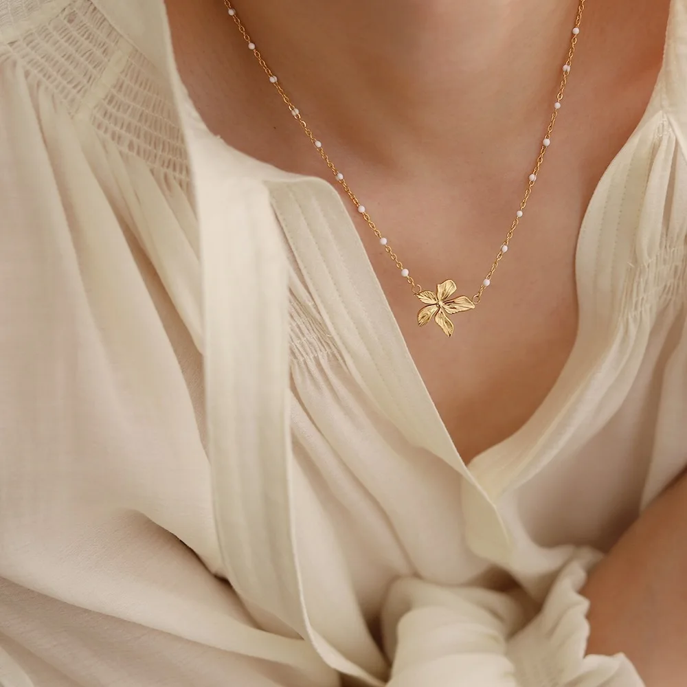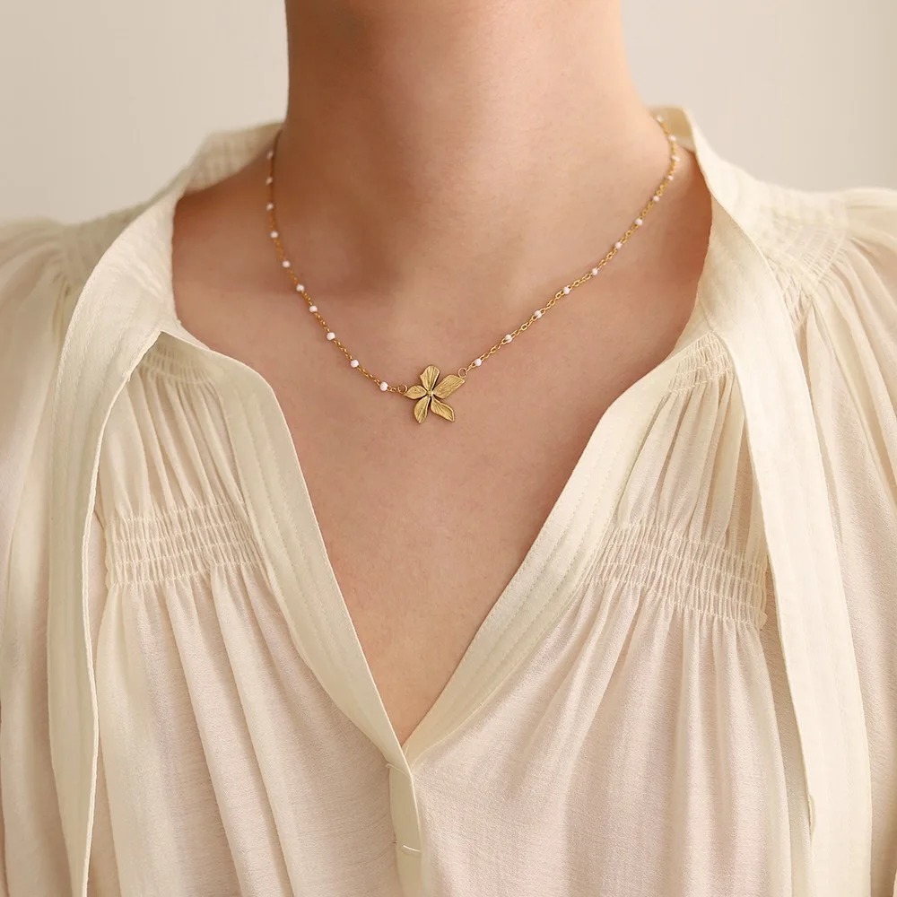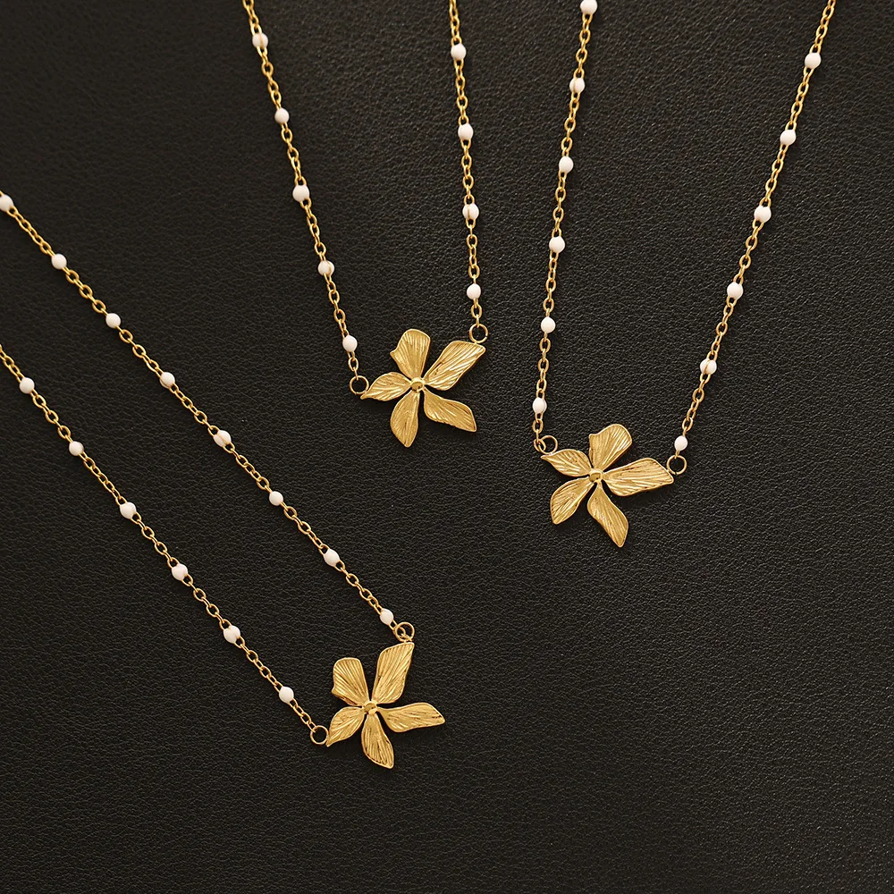White Bead Chain Petal Pendant Stainless Steel Chic Necklace for Women Fashion G