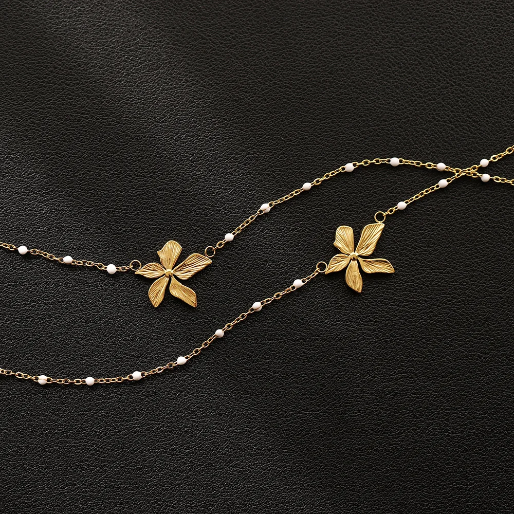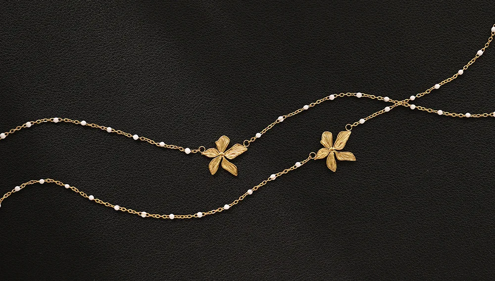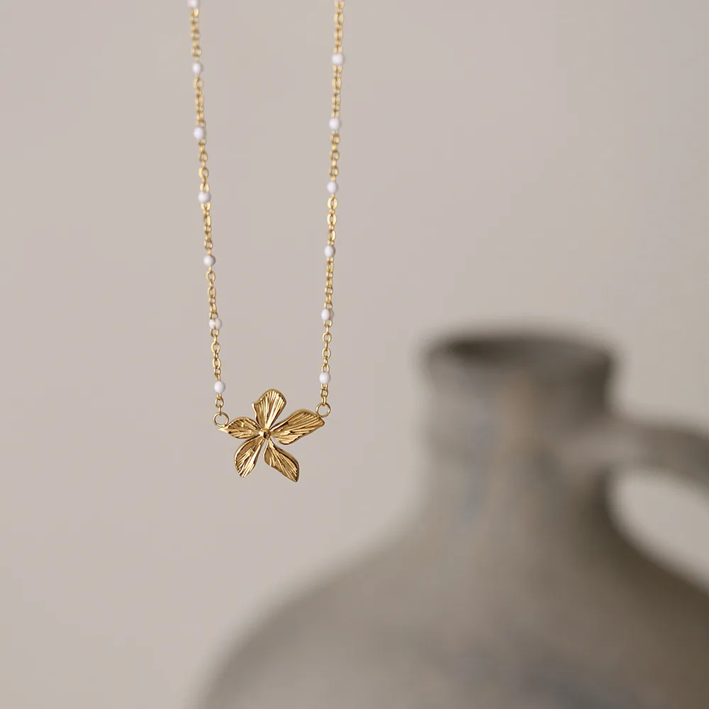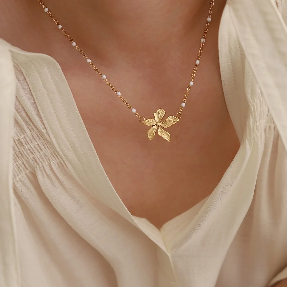 White Bead Chain Petal Pendant Stainless Steel Chic Necklace for Women Fashion G