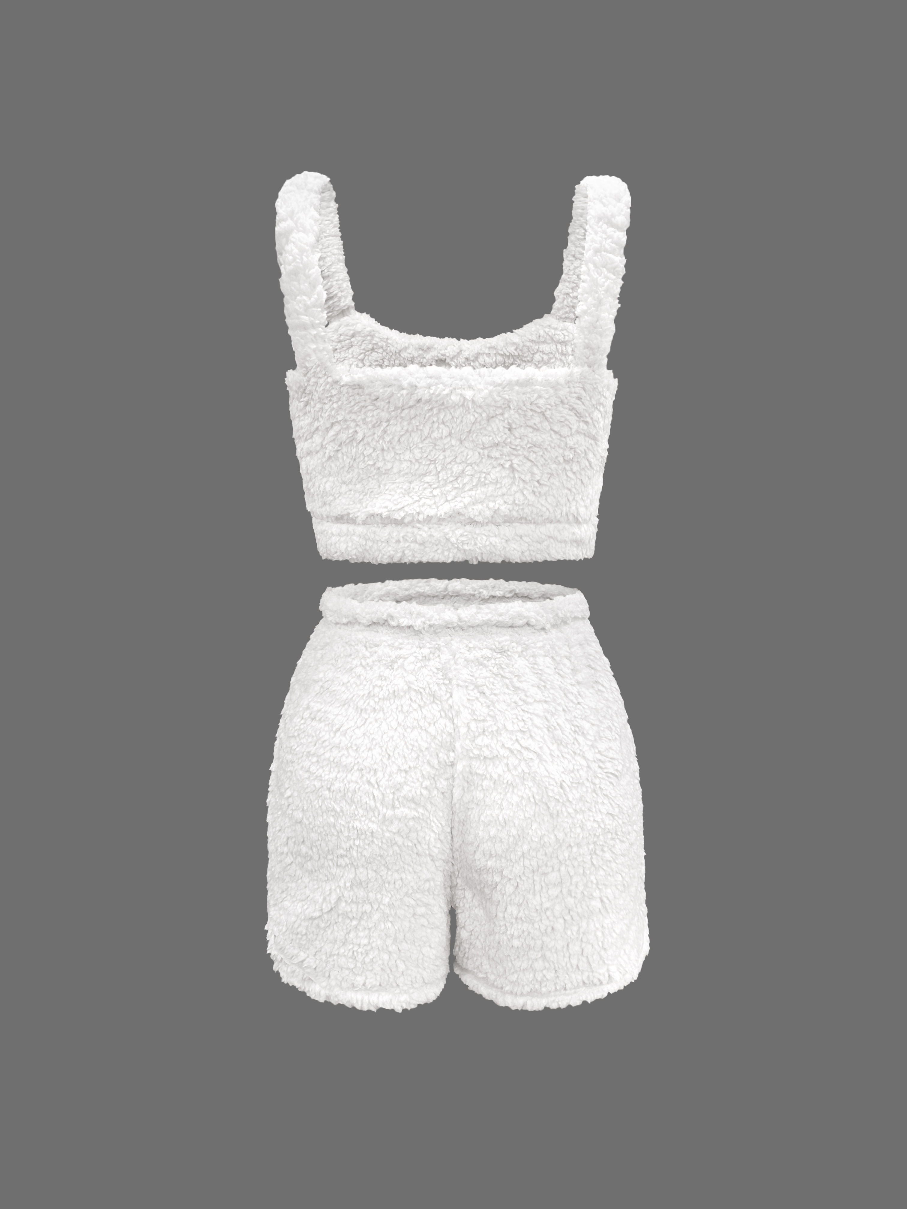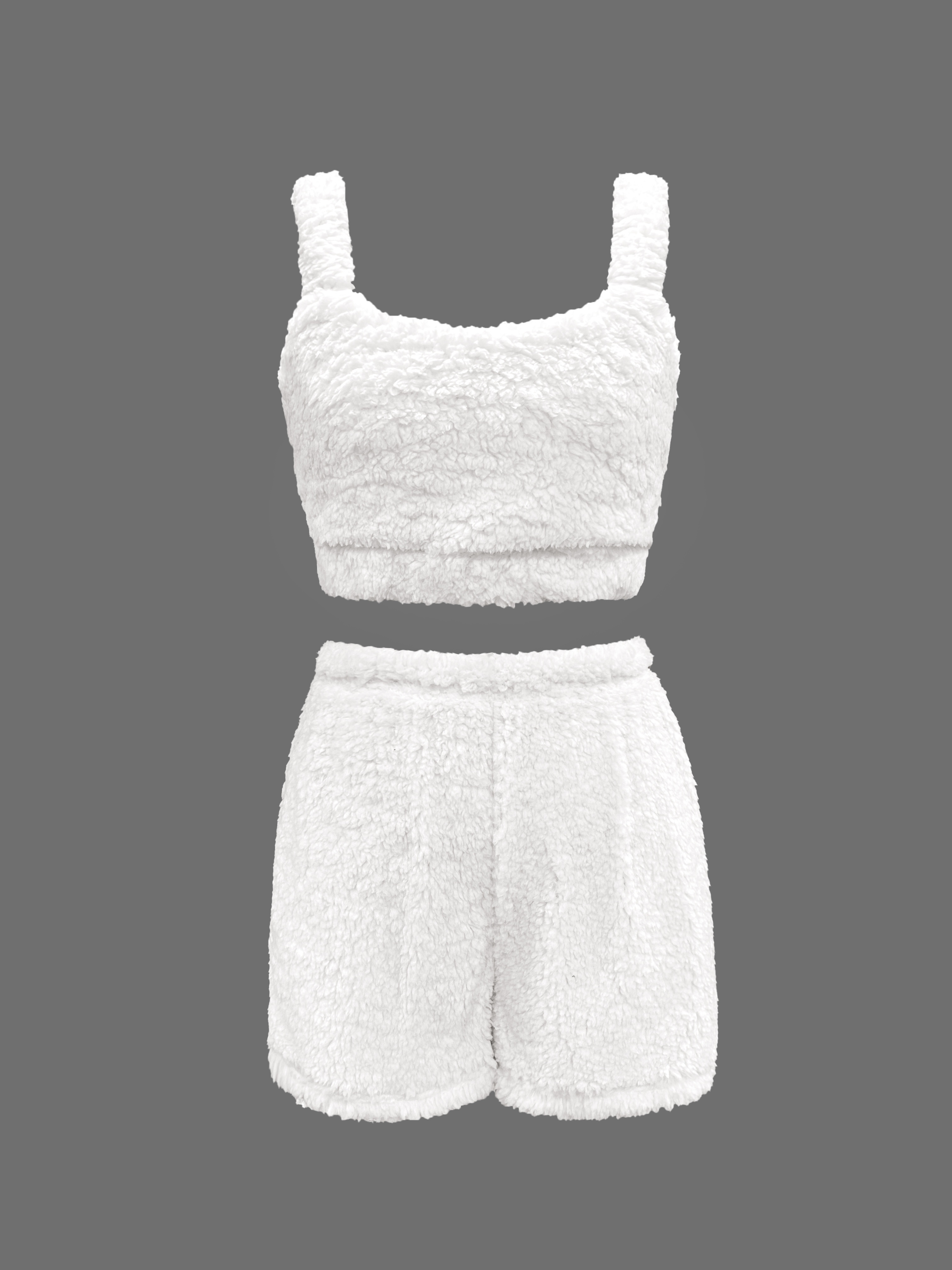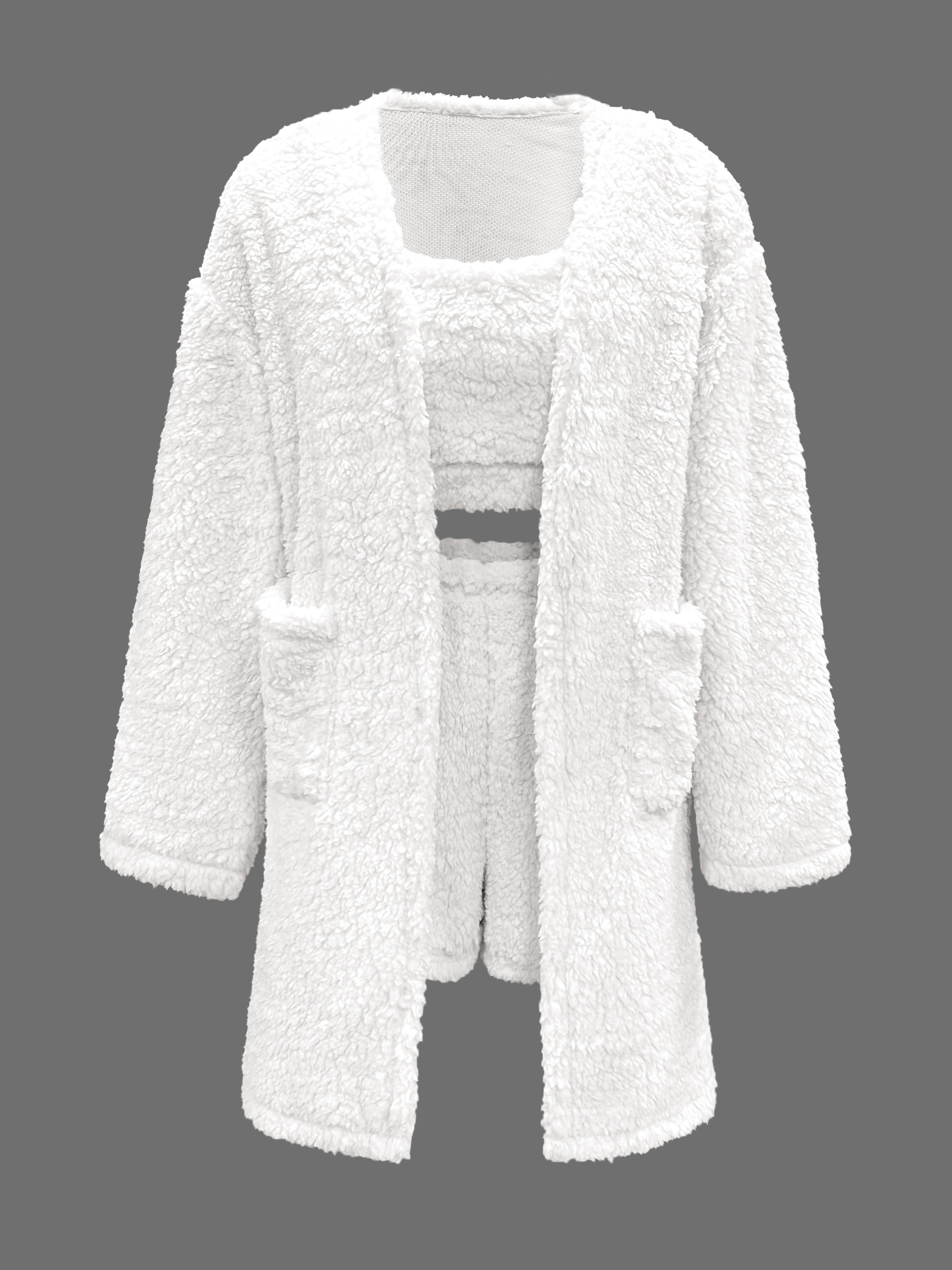 Women's Plush 3-Piece Set, Long Sleeve Jacket & Crop Top & Shorts, Casual Polyes